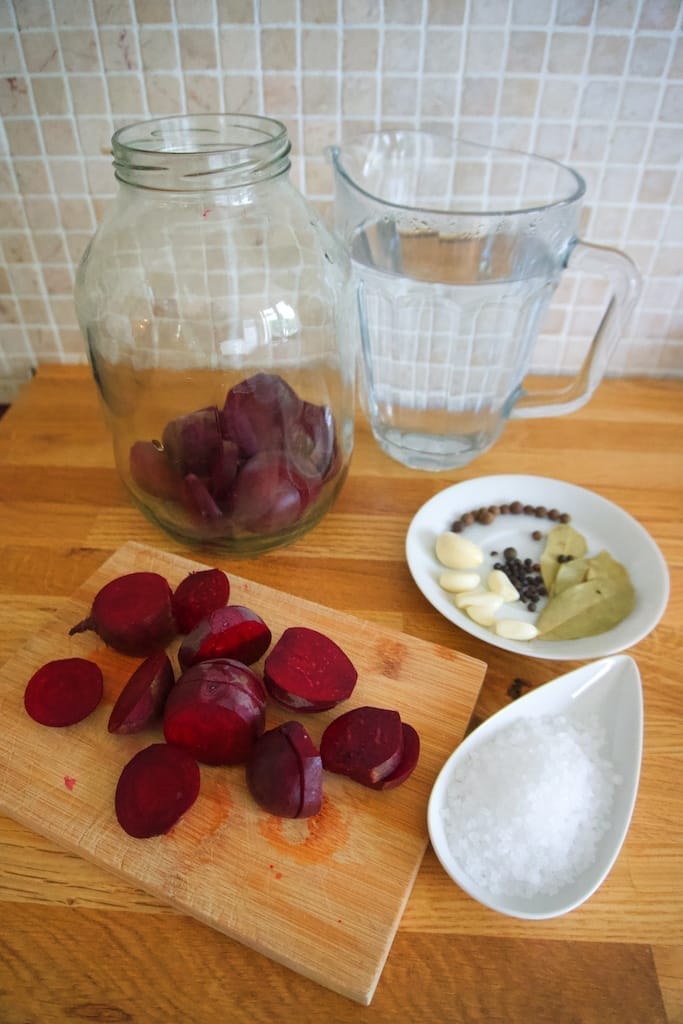 Slice the beetroots into thick 1/2cm slices. Place the beetroot slices in the jar.